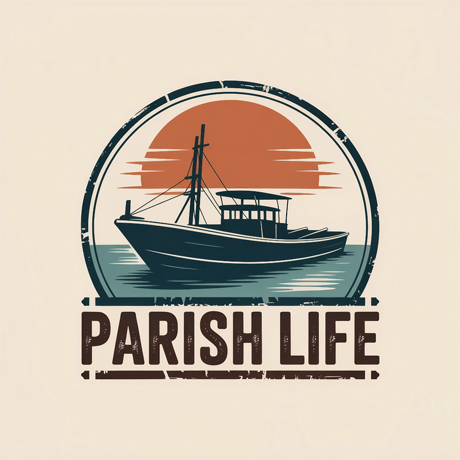 This listing features a high quality digital design of a fishing boat, perfect for a variety of creative projects. The design showcases a detailed fishing vessel against a backdrop of a setting sun, encircled by a textured frame, and the words “PARISH LIFE” displayed below.
